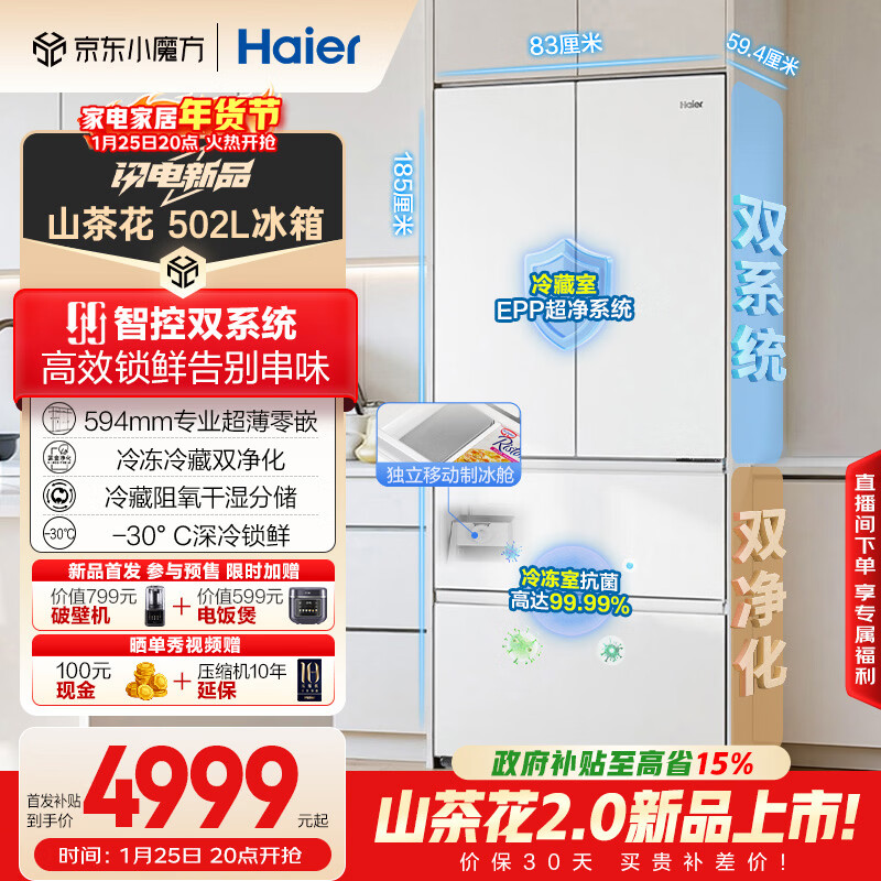 自营海尔(Haier)山茶花「485升级」502L法式多门冰箱双系统双净化超薄零嵌制冰一级BCD-502WGHFDC4FBU1国家补贴