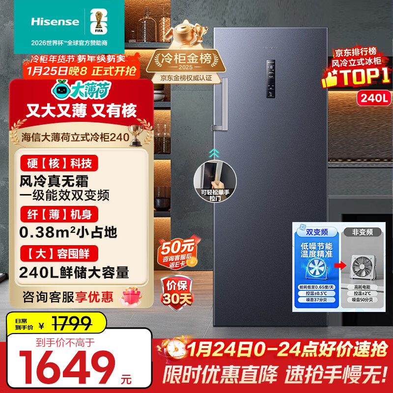 自营海信(Hisense)大薄荷系列240升立式家用冰柜变频一级能效风冷无霜小冰箱京东自营BD-240WPVUT国家补贴
