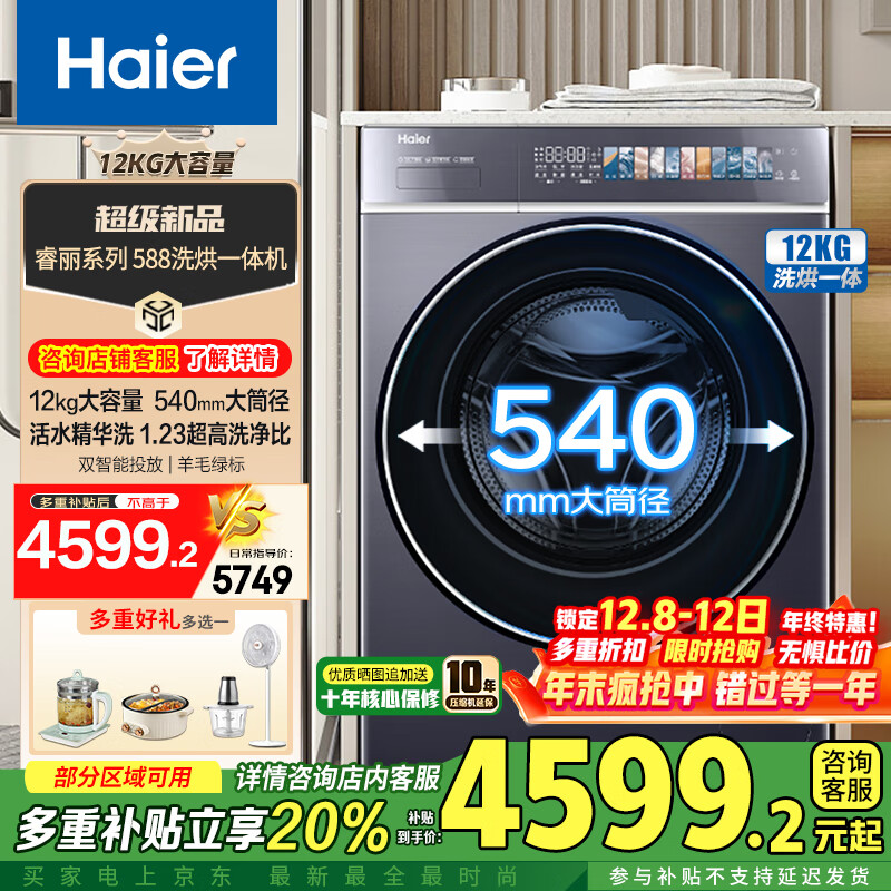 海尔(Haier)云溪4.0 新品12KG超薄嵌入洗衣机滚筒洗烘一体 精华洗智能柔烘羊毛绿标 540大筒洗衣机588 560机身+540大筒径+精华洗+空气洗+双智投