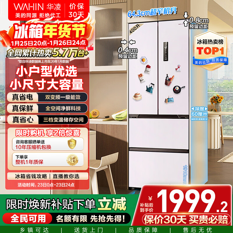 自营华凌美的出品400L法式多门60cm超薄零嵌入一级能效双变频净味风冷无霜家用电冰箱HR-419WUFPZ国家补贴