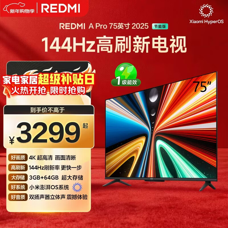 自营小米(MI)REDMI电视A Pro 75英寸94%广色域144Hz高刷 3GB+64GBL75RB-APE一级能效 智慧屏显示器家电