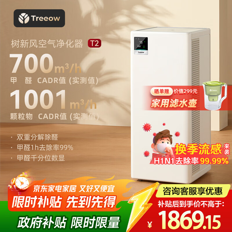 自营树新风空气净化器 除甲醛异味除菌除过敏认证家用大空间全效净化器T2【家电国家补贴】