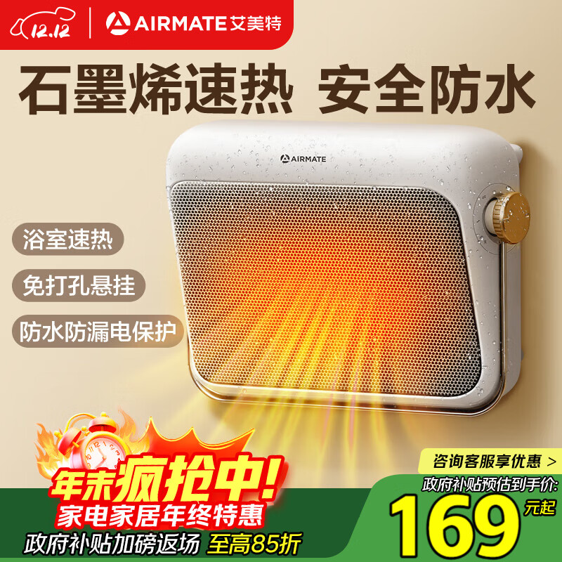 自营艾美特(AIRMATE)【石墨烯速热】浴室暖风机取暖器电暖器电暖气家用小太阳卫生间浴霸防水壁挂式小型洗澡电暖风