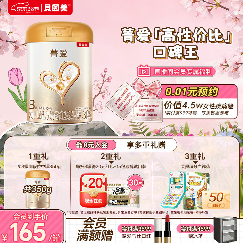 自营贝因美【焕新】菁爱12-36月幼儿配方奶粉3段800g骨骼发育消化吸收益生菌