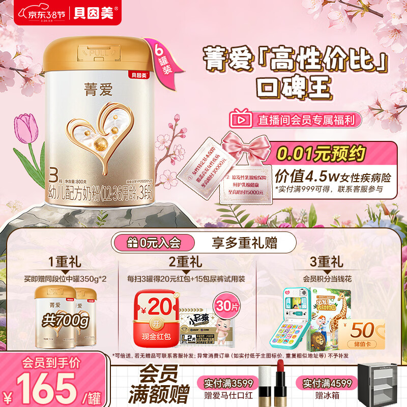 自营贝因美【焕新】菁爱12-36月幼儿配方奶粉3段800g*6 消化吸收含益生菌