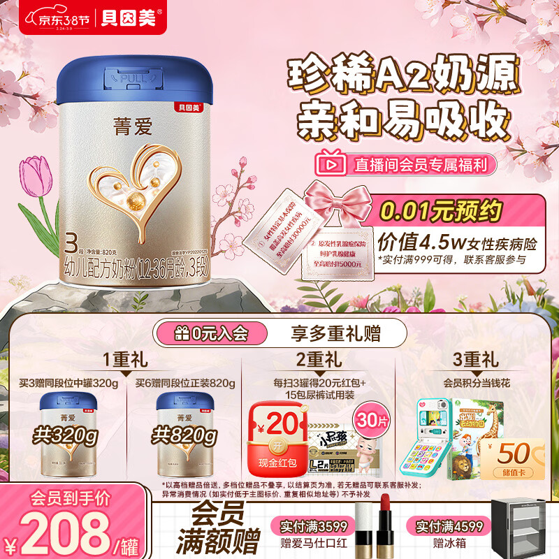 自营贝因美【焕新】菁爱A2奶源幼儿奶粉12-36个月 3段820g含A2-β酪蛋白