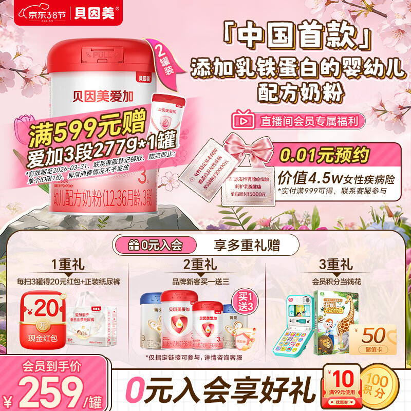 自营贝因美爱加12-36月幼儿奶粉大罐3段800g*2 免疫成长奶粉含乳铁蛋白
