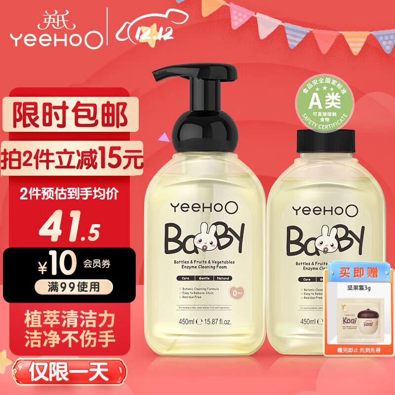 自营英氏奶瓶清洗剂洗奶嘴果蔬餐玩具婴儿童洗洁精泡沫柠檬酸除垢450ml*2