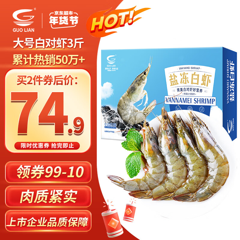 自营GUO LIAN国联盐冻大虾净重3斤75-90只 50/60 南美白对虾生鲜海鲜年货送礼