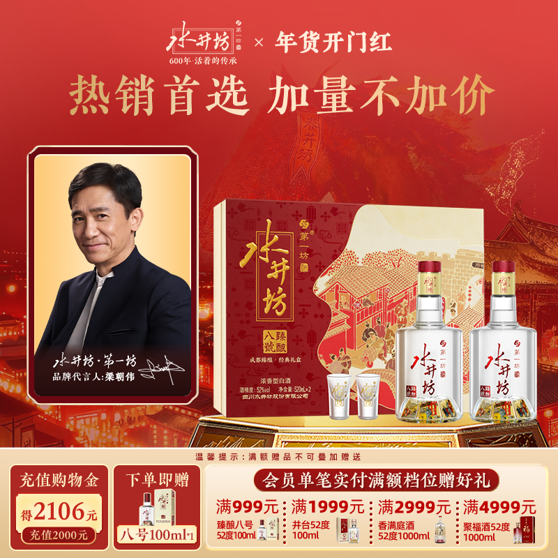 旗舰店【详情页领淘金币】水井坊臻酿八号52度520ml双支礼盒浓香送礼-