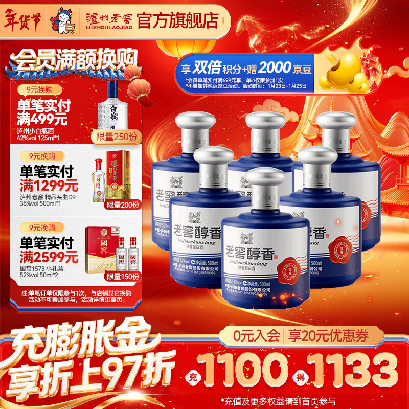 旗舰店泸州老窖老窖醇香 浓香型白酒 节日送礼 过年礼品 52度 500mL 6瓶 宝卷整箱装