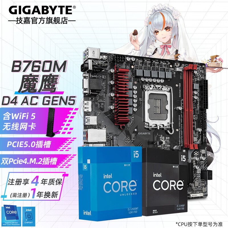 旗舰店技嘉英特尔12代 i5 /12490F/12600KF 搭 B760M 小雕/魔鹰WiFi 单主板CPU套装 B760M G AC D4 GEN5 魔鹰WiFi 单主板