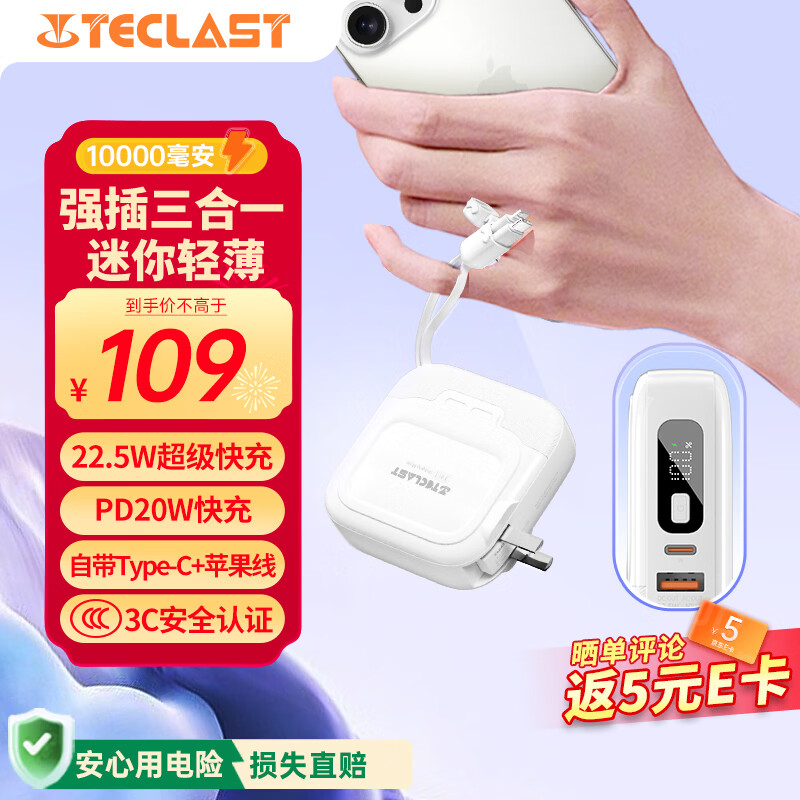 自营台电(TECLAST)充电宝【3C认证】10000毫安时三合一插头自带线22.5W快充可上飞机移动电源 适用小米苹果安卓白色