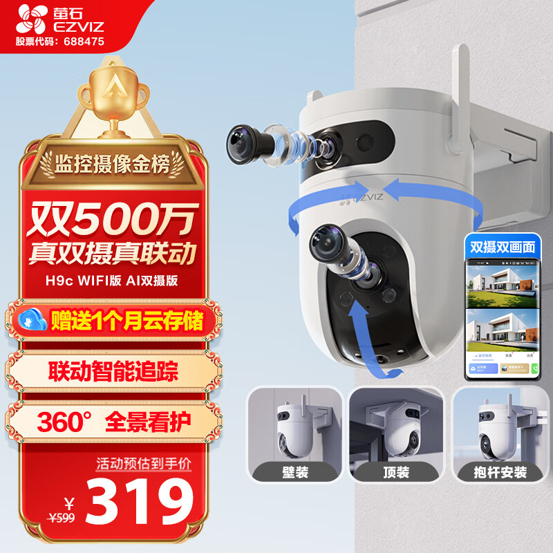 自营萤石H9c室外500万双摄联动监控摄像头 360度无死角全景云台 带夜视 防水防尘 手机远程 自动巡航