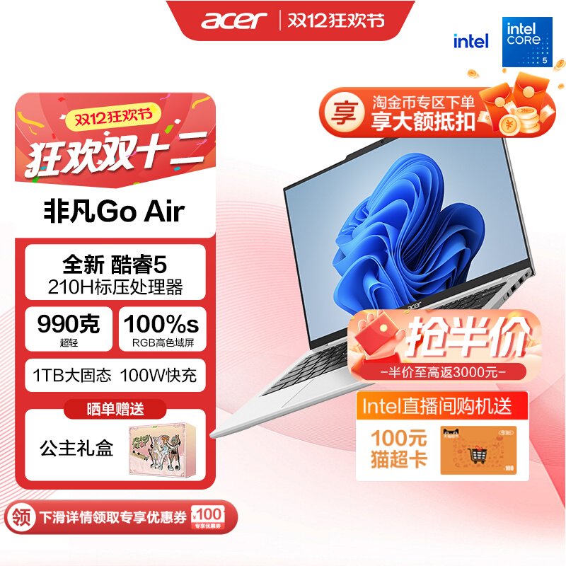 旗舰店(政府补贴)Acer/宏碁酷睿非凡Go Air 990g大学生超轻薄笔记本电脑学习网课设计商务办公便携