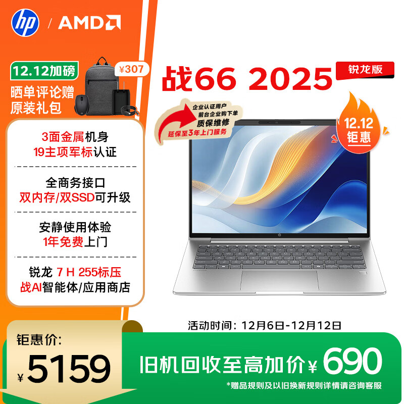 自营惠普(HP)战66 14英寸2025轻薄笔记本电脑 标压锐龙7 H 255 32G 1T 2.5K屏 1年上门【国家补贴】