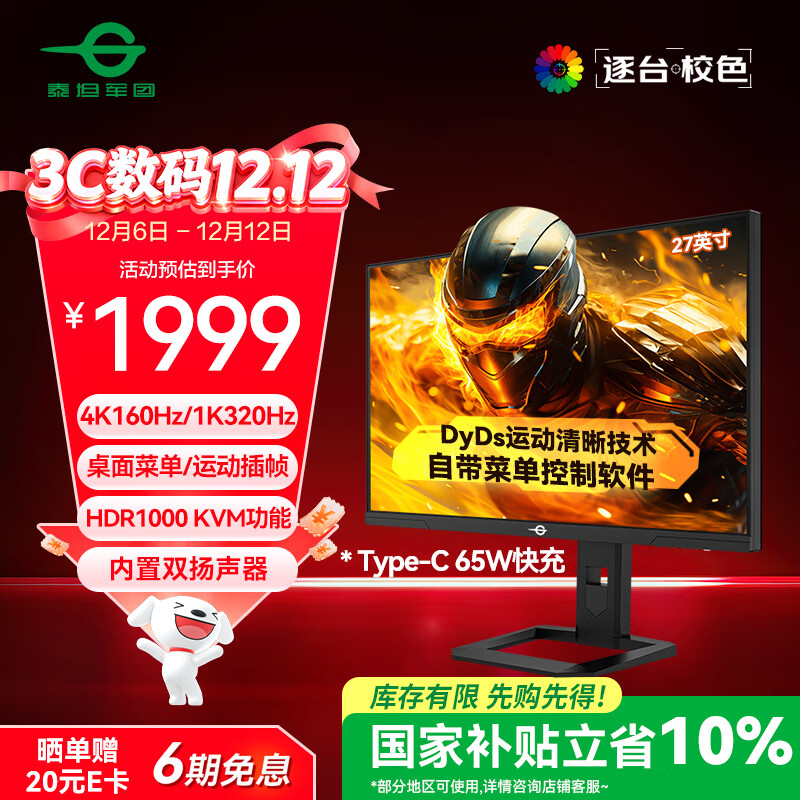 自营泰坦军团27英寸QD-MiniLED 4K 160Hz双模320Hz DyDs技术 Type-C 65W 内置音箱电竞显示器P275MV PLUS增强版