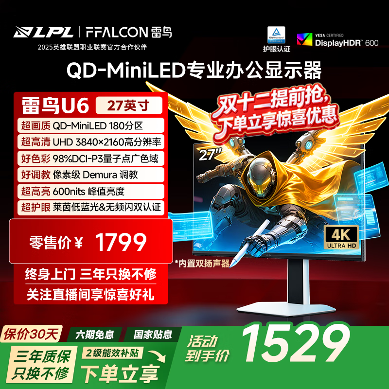 自营FFALCON雷鸟U6 27英寸4K QD-MiniLED办公显示器 HDR600 Type-C 65W 专业MAC模式 护眼认证 旋转升降显示屏