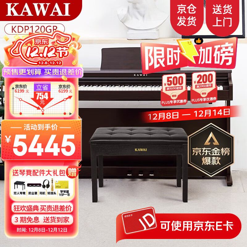旗舰店卡瓦依(KAWAI)电钢琴立式逐级重锤88键钢琴键盘 卡哇伊KDP120专业考级数码乐器 KDP120GR檀木色全套+琴凳礼包