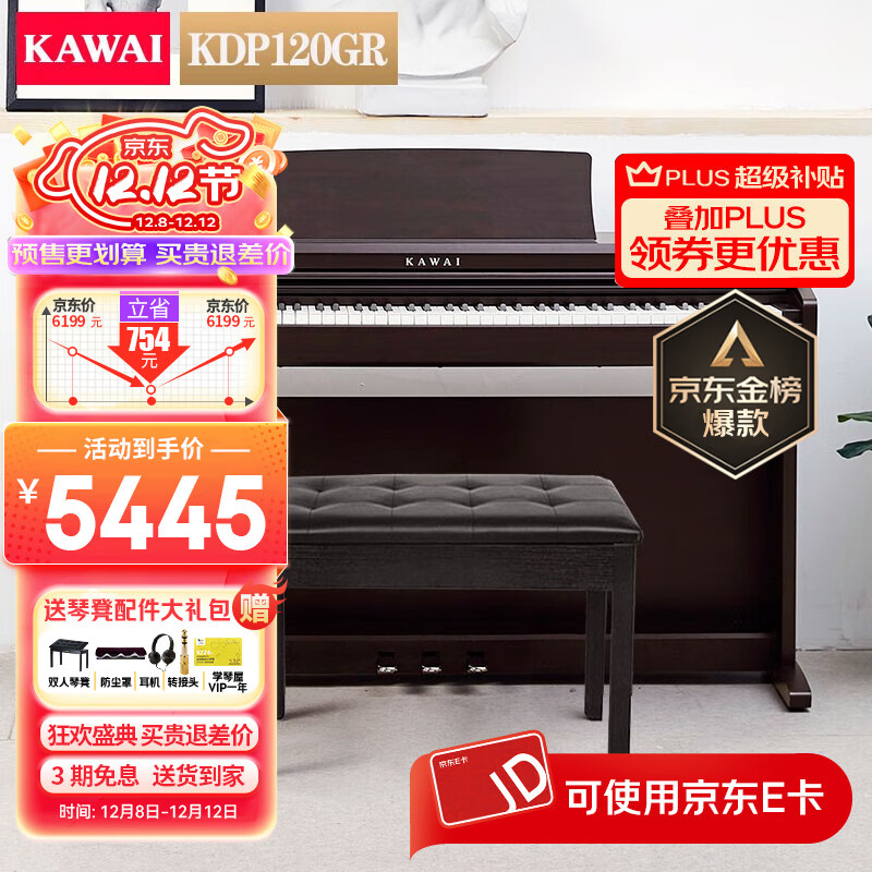 旗舰店卡瓦依(KAWAI)KDP120电钢琴88键重锤逐键采音卡哇伊成人电子数码钢琴圣诞节礼物 KDP120GR全套+琴凳礼包