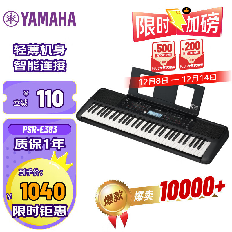 自营雅马哈(YAMAHA)PSR-E383 儿童成年娱乐学习专业演奏教学力度键电子琴61键