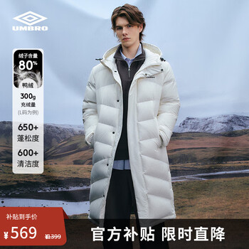 旗舰店茵宝(Umbro)运动羽绒服连帽中长款户外保暖百搭冬季大衣外套 象牙白(白鸭绒) L (充绒量:300g)