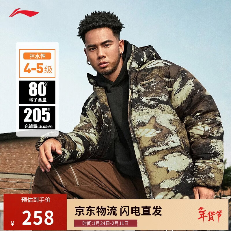 自营李宁反伍丨防泼水科技羽绒服男子宽松80%鸭绒短款连帽外套AYMU197