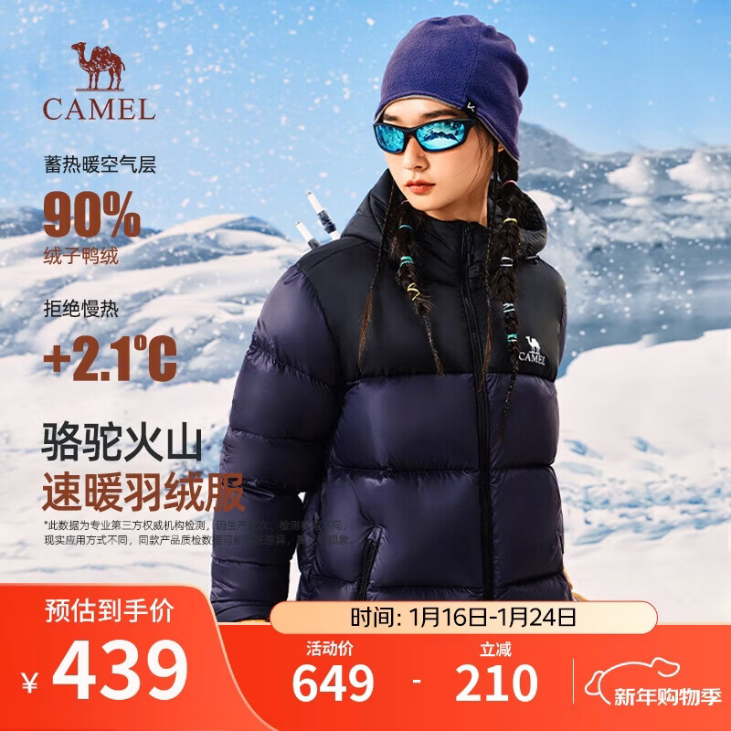 自营骆驼火山羽绒服防泼水白鸭绒冬季男女款加厚户外防寒冬季 M13CR07089H