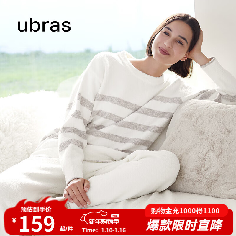 旗舰店ubras【刘雯同款】慕斯绒条纹保暖加绒家居服套装女加厚加绒睡衣冬季女 女款圆领-拿铁灰色 M