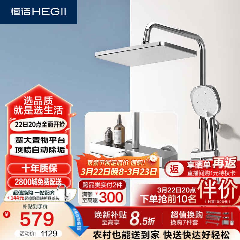 自营恒洁(HEGII)淋浴花洒套装S3 智能双重除垢大平台方形顶喷花洒全套HMF936-333