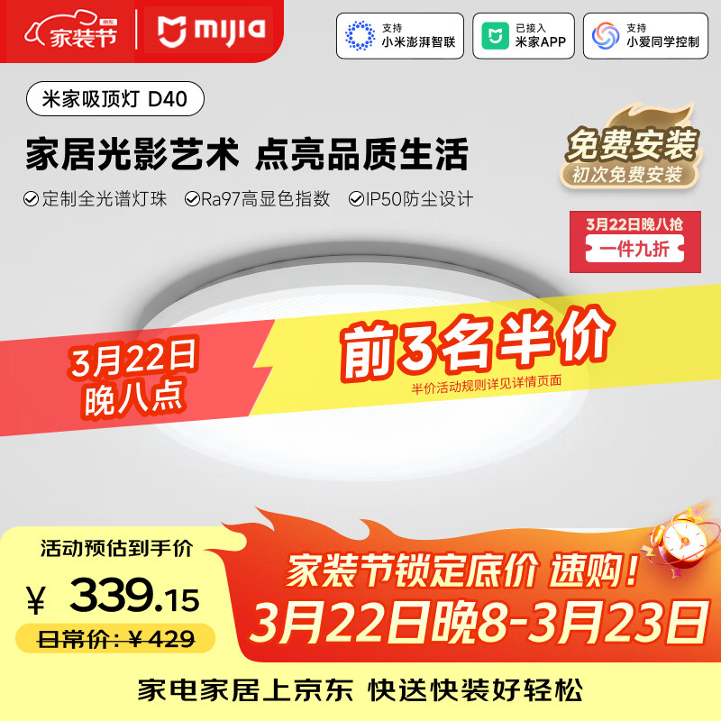 自营米家小米智能吸顶灯D40全光谱卧室灯儿童房书房灯具现代【包安装】