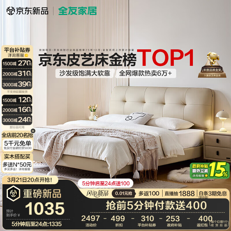 自营全友家居 奶油风头层牛皮茉伊真皮床头软包靠背卧室家用1.8米双人大床