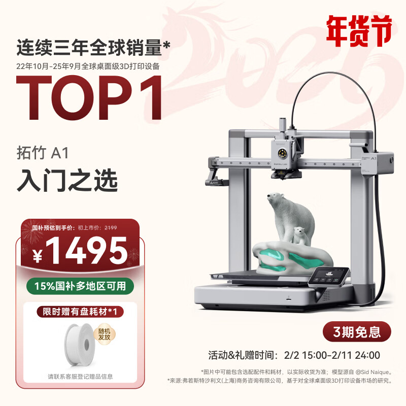 自营拓竹A1 3D打印机桌面家用FDM全自动调平高速3d打印机器【大陆版】