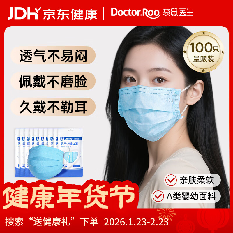 自营袋鼠医生一次性医用外科口罩成人100只防尘透气雾霾防风冬季保暖正规医用