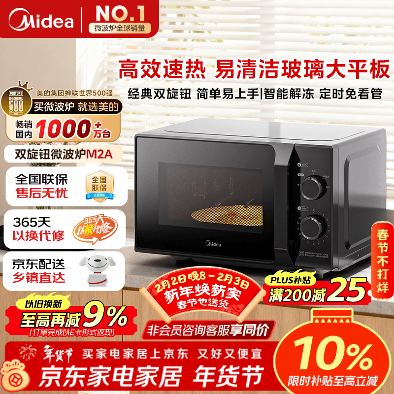 自营美的(Midea)微波炉经典升级款M2A 家用小型20升平板式易清洁快捷双旋钮高效速热杀菌除味以旧换新