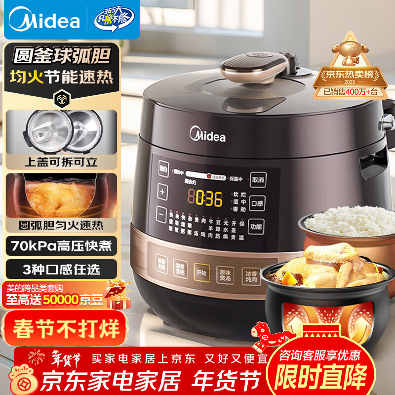 自营美的(Midea)【京东自营】官方电压力锅高压双球胆电饭煲 全自动智能预约家用4-6人煲汤煮小米YL50Easy203饭锅