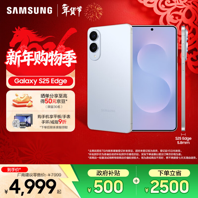 旗舰店三星(SAMSUNG)Galaxy S25 Edge 5.8mm纤薄机身 IP68耐用设计 骁龙8至尊版 2亿像素拍照旗舰AI手机 钛蓝 12GB+256GB 官方标配