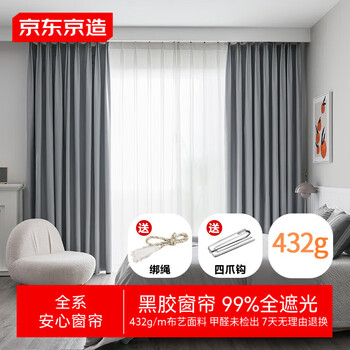 自营京东京造黑胶浅灰窗帘 99%全遮光窗帘布飘窗卧室遮阳帘挂钩式 宽2*高2.7米