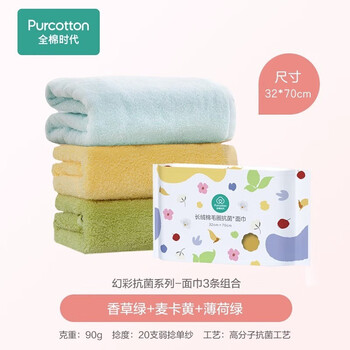 自营全棉时代长绒棉抗菌0添加毛圈纯棉毛巾3条装香草绿/麦卡黄/薄荷绿32*70cm