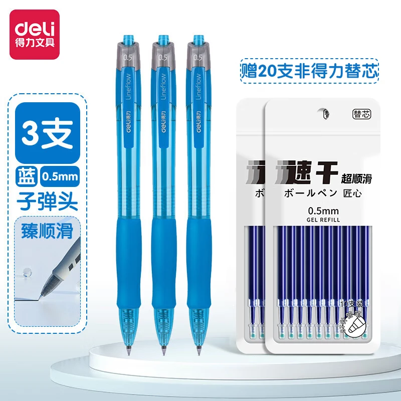 得力按动式臻顺滑中性笔签字笔0.5mm子弹头学生考试专用黑色教师红笔医生蓝墨蓝笔速干碳素水笔S08 3支笔+20支非得力替芯【蓝色】