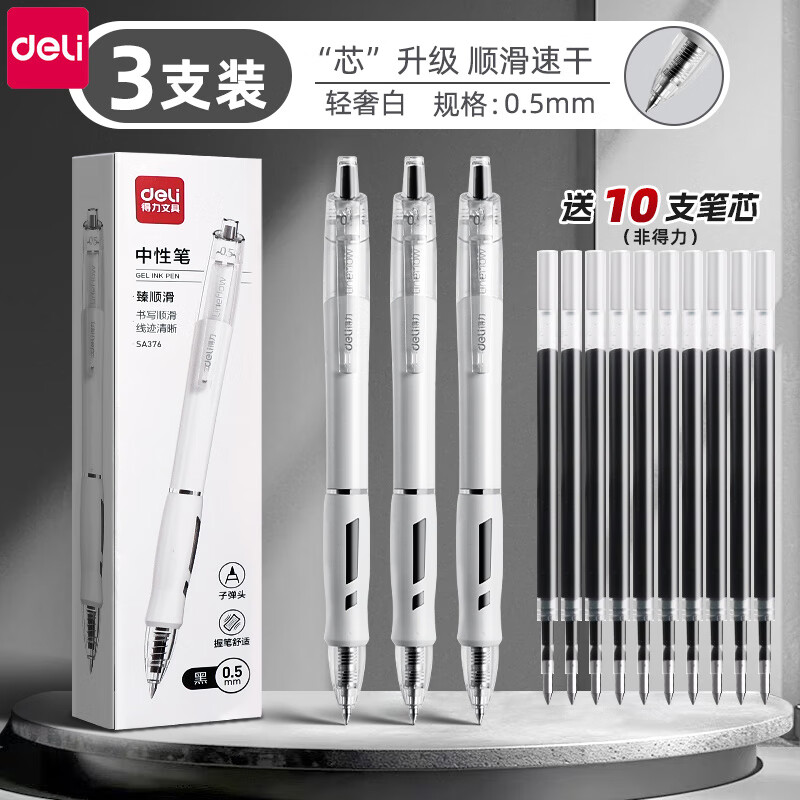 旗舰店得力(deli)按动中性笔黑色子弹头0.5速干顺滑黑笔学生用考试蓝黑色水笔圆珠笔按压式签字笔大容量 【臻顺滑】白杆3支装(送10支黑色笔芯)