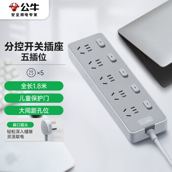 自营公牛(BULL)公牛(BULL)新国标插座/插线板/插排/排插/接线板/拖线板 Z世代 5位分控开关全长1.8米GN-Z1053J