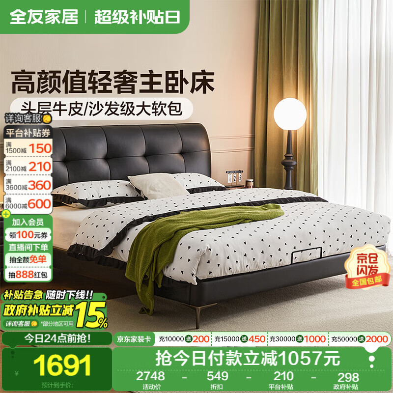 自营全友家居意式简约风头层牛皮床头软包靠背卧室1.8米×2米真皮双人大床