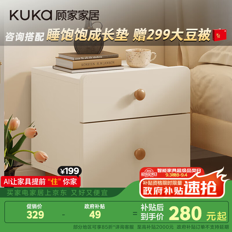 自营顾家家居现代简约床头柜木纹拉手双抽储物卧室床头柜DS7991G【奶酪白】