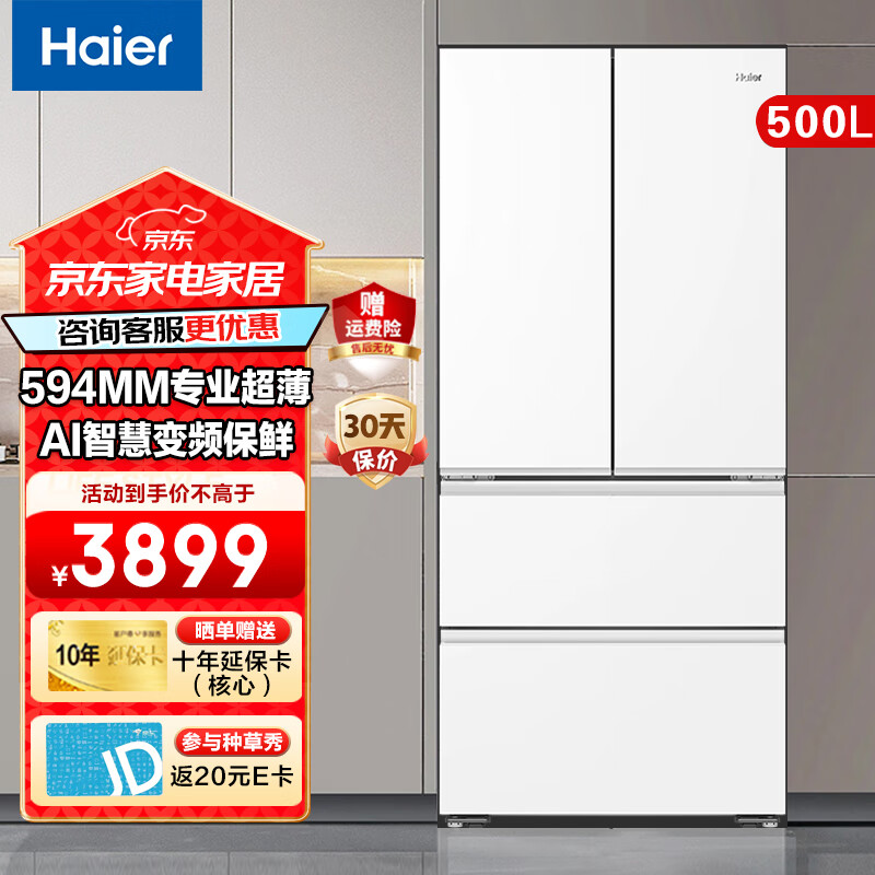 旗舰店海尔(Haier)500升小红花绽放版594mm专业超薄法式多门四开门黑金净化AI智慧变温节能家用电冰箱 500升超薄机身+黑金净化+三档变温