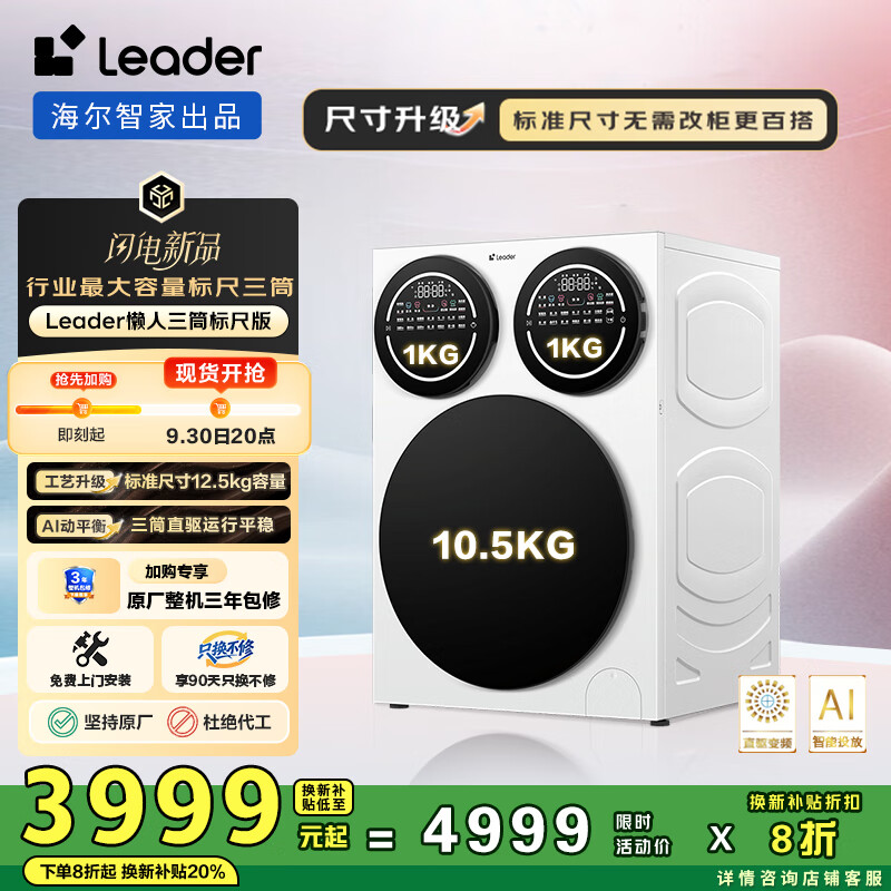 自营统帅(Leader)海尔智家【海尔许愿京东实现】懒人三筒洗衣机标尺版 12.5公斤 XQGL125-MBDE699WU1三桶换新