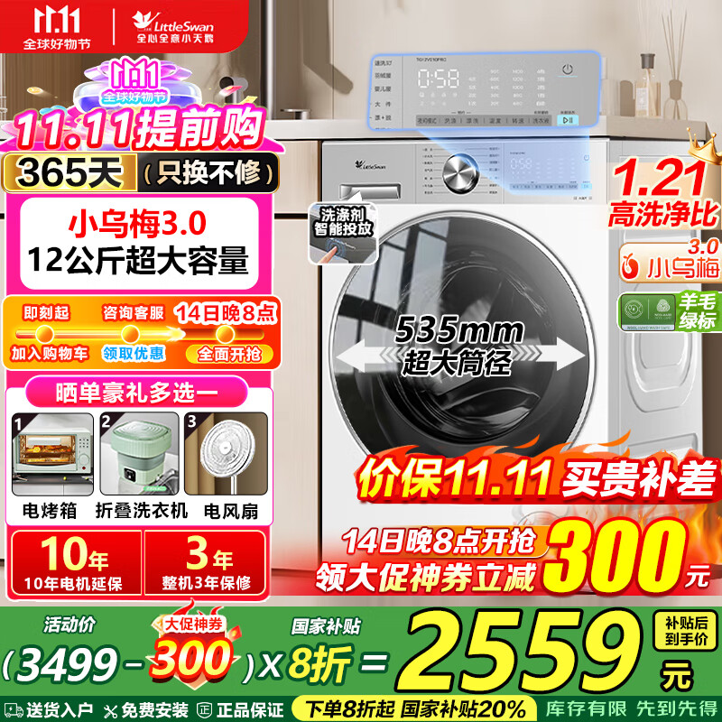 百亿补贴【全民国补】美的10/12kg洗衣机1.1洗净比全自动除菌螨滚筒洗烘36