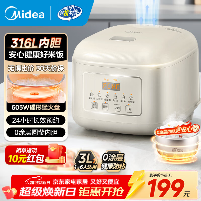 旗舰店美的(Midea)电饭煲电饭锅家用商用柴火饭多功能预约小型迷你煮饭2-3-5-8人大容量不锈钢内胆不易粘锅年货好物 0涂层 3L 母婴级316L不锈钢内胆卡其灰偏白