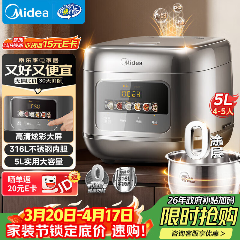 百亿补贴美的(Midea)电饭煲家用电饭锅5L大容量4-5-8-10人 0涂层内胆不粘锅 柴火饭快速饭多功能一体煮粥锅 政府补贴 行业爆款 5L 【新一代0涂层健康无脱落】