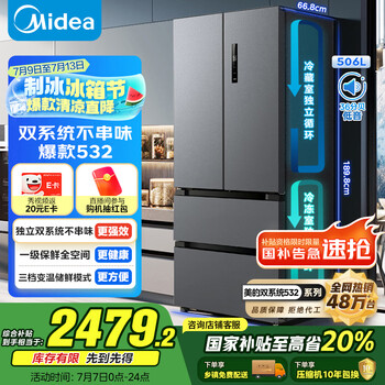 自营美的(Midea)532法式多门四门变频一级能效家用冰箱国家补贴20%双系统双循环大容量无霜智能MR-532WFPZE谷雨灰